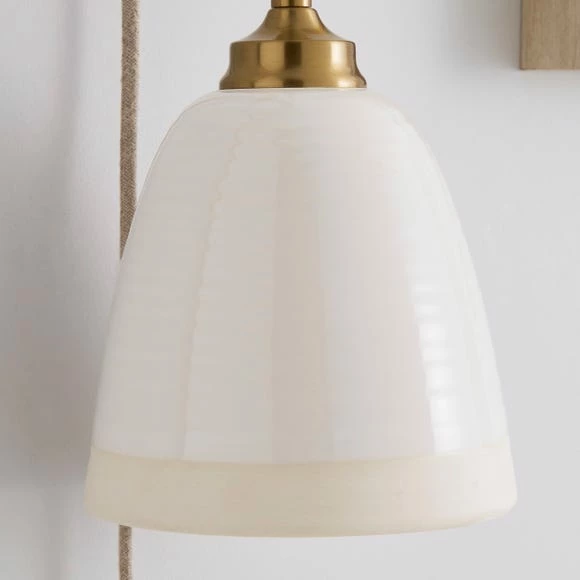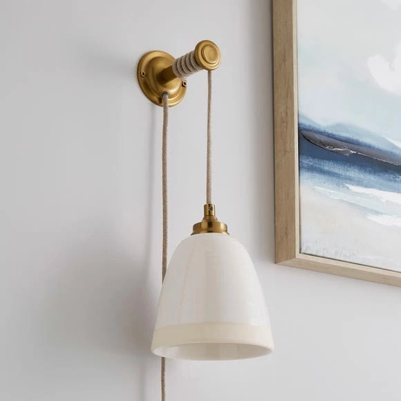 Introducing the Churchgate Harby Ceramic Easy Fit Plug In Wall Light, designed with a stunning White ceramic glazed head, finished in an antique gold metal and complete with a white twisted cable. Perfect for adding a modern touch to your home. Matching family items to help coordinate your décor.